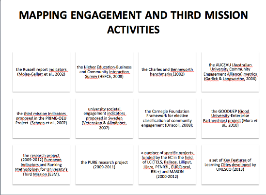 Muovendo dall’esame degli esiti maggiormente rilevanti e delle precedenti esperienze di ricerca sugli indicatori di sviluppo per valutare le attività relative alla Terza Missione e allo sviluppo delle learning city, è nata, nell'ambito del Fir 2014 del'Università di Catania, la proposta progettuale "Lo sviluppo delle learning cities - Indicatori per l’autovalutazione della Terza missione delle Università". L’attività di ricerca che volge alla sua conclusione si è proposta di definire gli indicatori da adottare per valutare e monitorare la Terza Missione delle università nel contesto italiano.