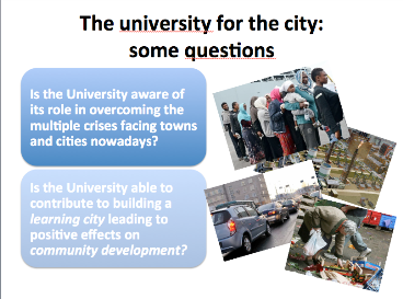 Il coinvolgimento delle Università nello sviluppo del territorio dovrebbe invece ampliarsi e riguardare la possibilità per gli Atenei di mettere a sistema e a servizio le proprie competenze a favore della società civile, nelle sfide che essa giornalmente è chiamata a sostenere. Queste sono le conclusioni emerse da una serie di studi e di ricerche europei condotti allo scopo di esplorare le opportunità che le università hanno di misurare le loro prestazioni per la costruzione della learning city grazie ai positivi effetti sullo sviluppo della comunità.